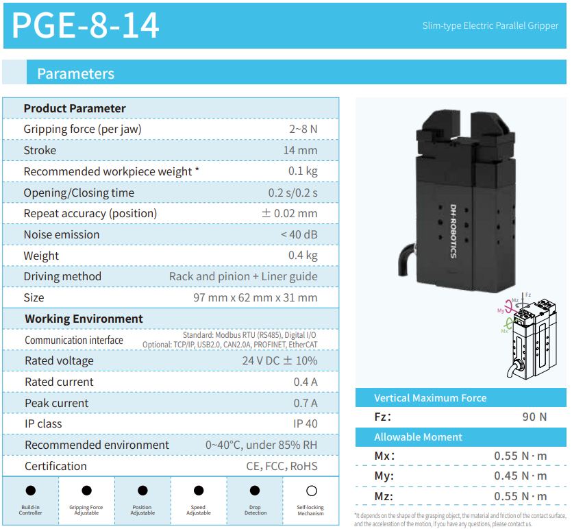 myCobot Pro industrial thin parallel electric jaws can respond quickly and have a high grasping frequency. Fit for ER myCobot 320 2022、 ER myCobot pro 630. It can be used in the fields of workpiece transfer, machine tool loading and unloading, assembly and assembly, and experimental teaching.