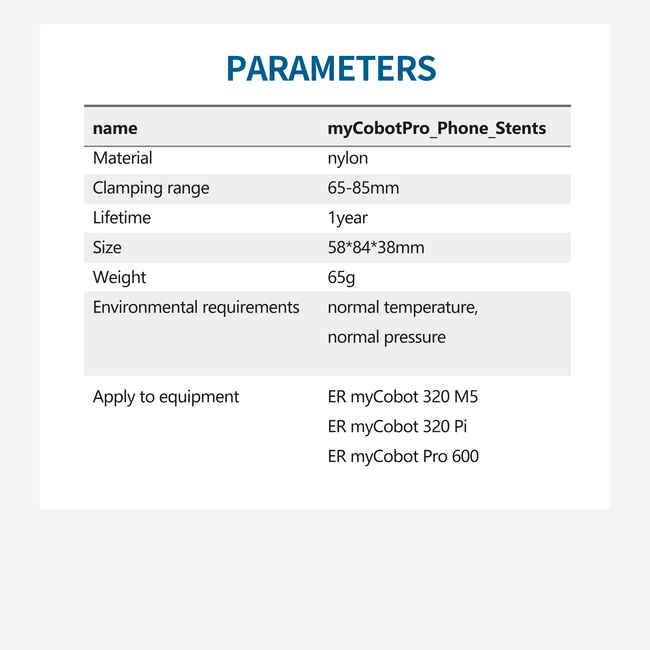 myCobot Pro Phone Holder can be used for myCobot 320 M5Stack 2022、myCobot 320 PI 2022、myCobot Pro 630 Robot arm. Phone Holde picks up the phone and doesn't let go. Use it to accomplish a complete lineup of applications.